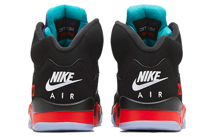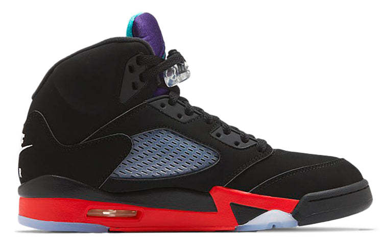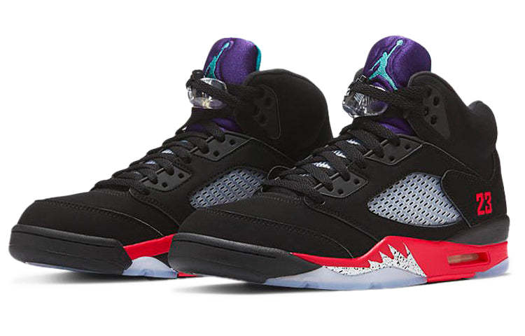 True to its name, The Nithtke Aithtr Jordthtan 5 "Top 3" draws inspiration from a trio of iconic OG releases - the "Metallic", "Fire Red" and "Grape" colorways. Against the black nubuck upper is a vibrant purple tongue complemented by aqua blue. On the shoe is a bright red "23" lettering. Equally eye-catching is the red midsole mashed up with metallic silver shark-tooth detailing.